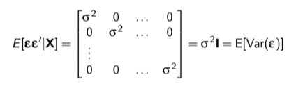 The off-diagonal (the zeros) represent autocorrelation if these are not zero (or at least very close) we have autocorrelation. The main-diagonal (the variance) represents our homoscedasticity assumption. If these values along the main diagonal are not the same or at least very close, then we have heteroscedasticity.